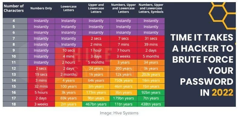 The below graphic represents the time it would take for a cybercriminal to hack (brute force) a password using current technological capabilities.